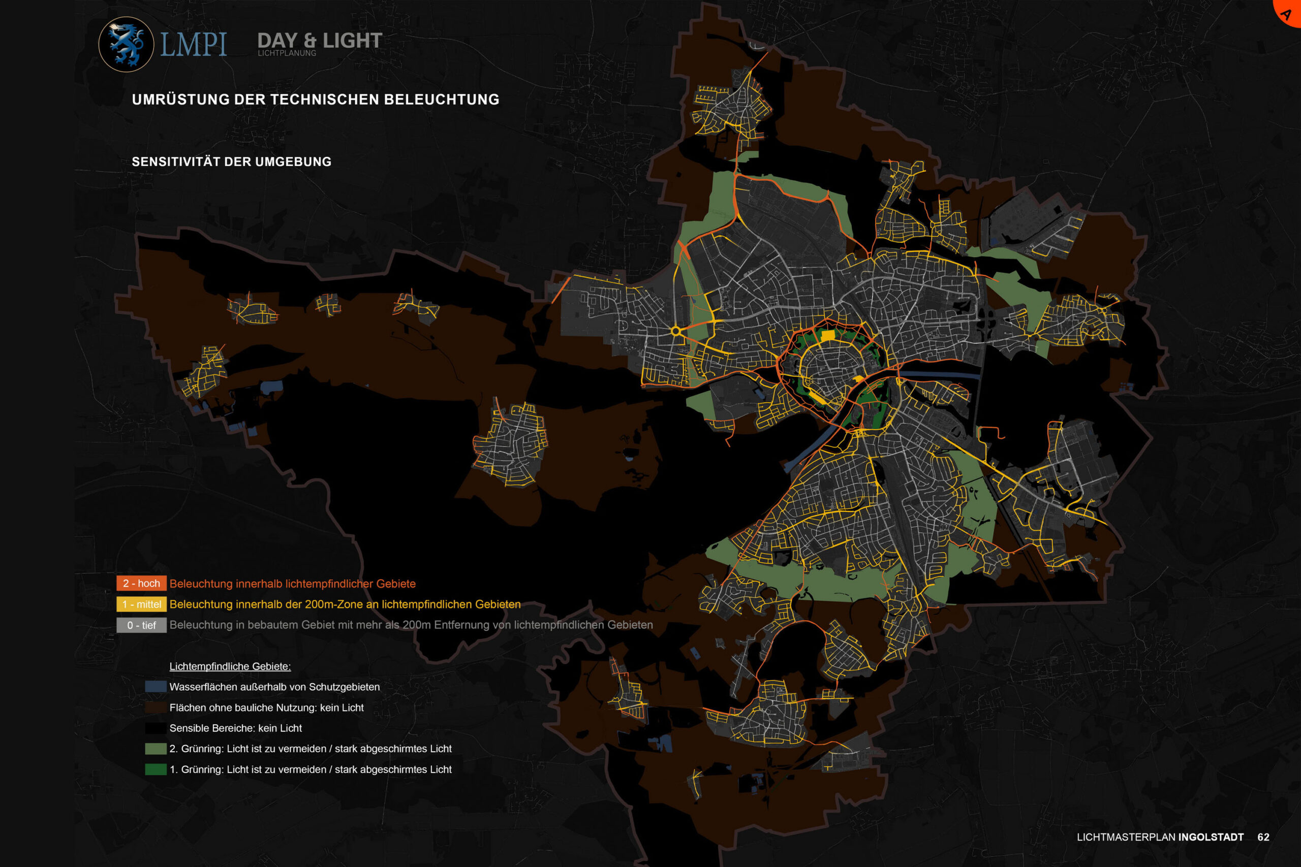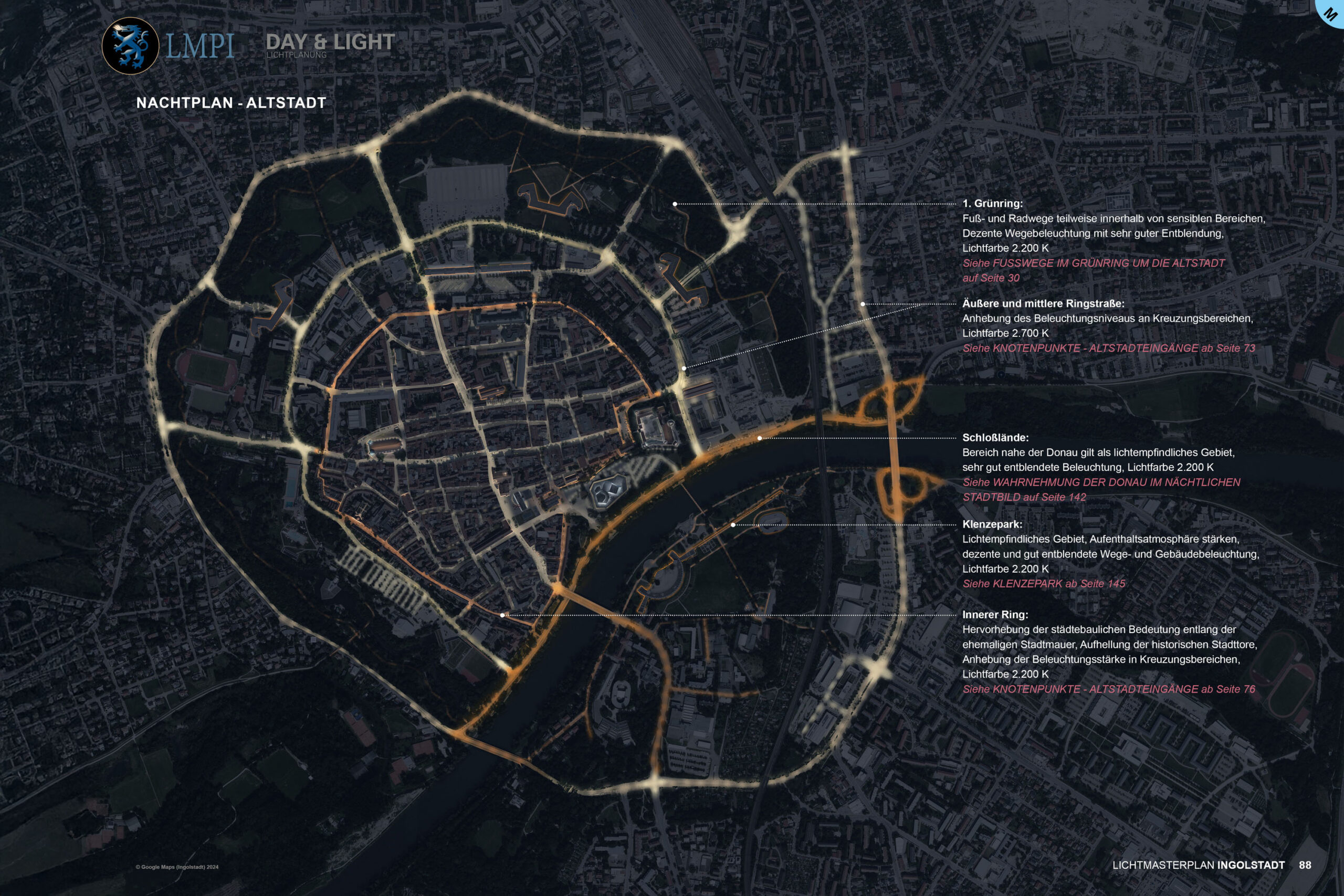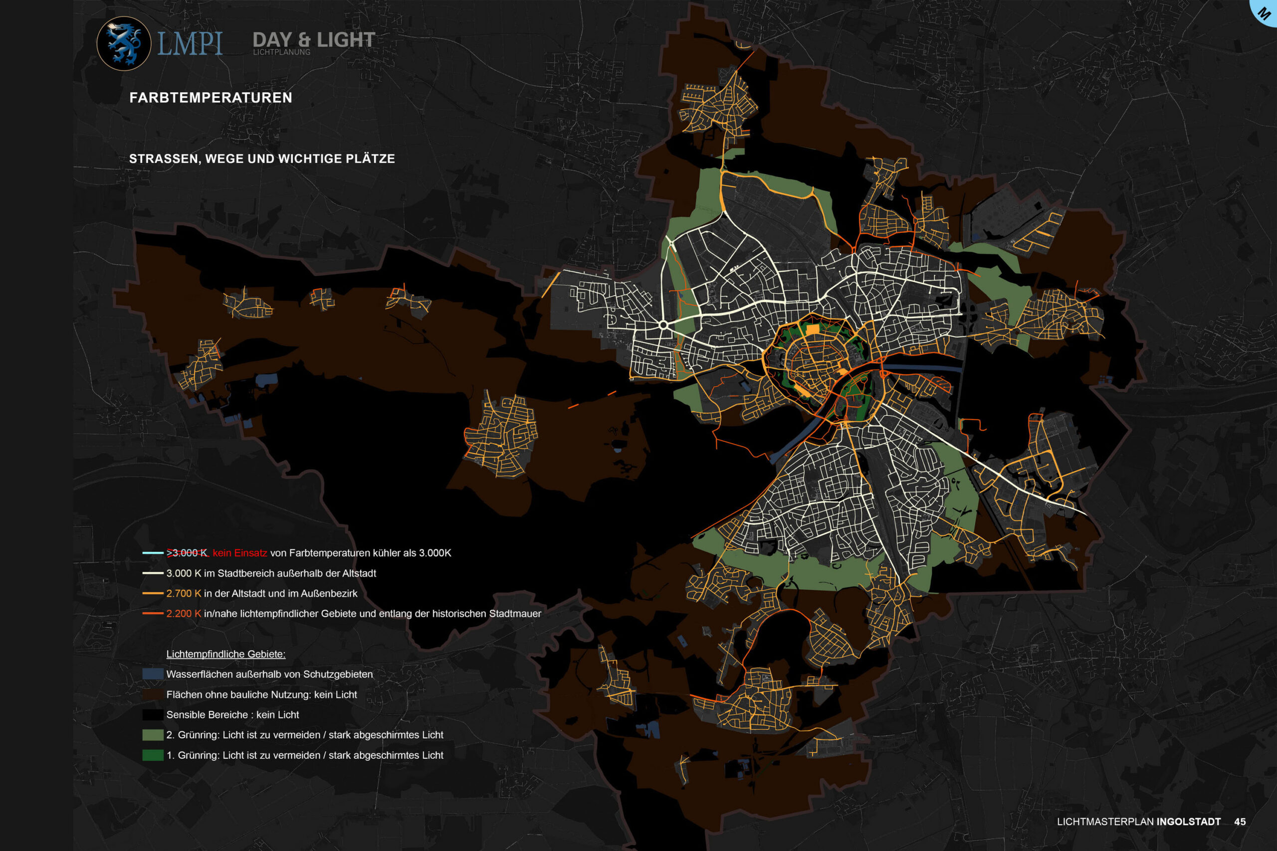 Der Lichtmasterplan Ingolstadt (LMPI) setzt sich mit der gezielten Ordnung und Gestaltung des städtischen Lichtbildes auseinander. Er soll ein praxistaugliches Werkzeug für die Stadtplanung der kommenden Jahre sein – ganzheitlich, nachhaltig und gestalterisch fundiert. Ziel ist es, ein ausgewogenes, charakterstarkes und umweltschonendes Nachtbild zu schaffen, das sowohl die historische Altstadt als auch moderne Stadtbereiche angemessen berücksichtigt.