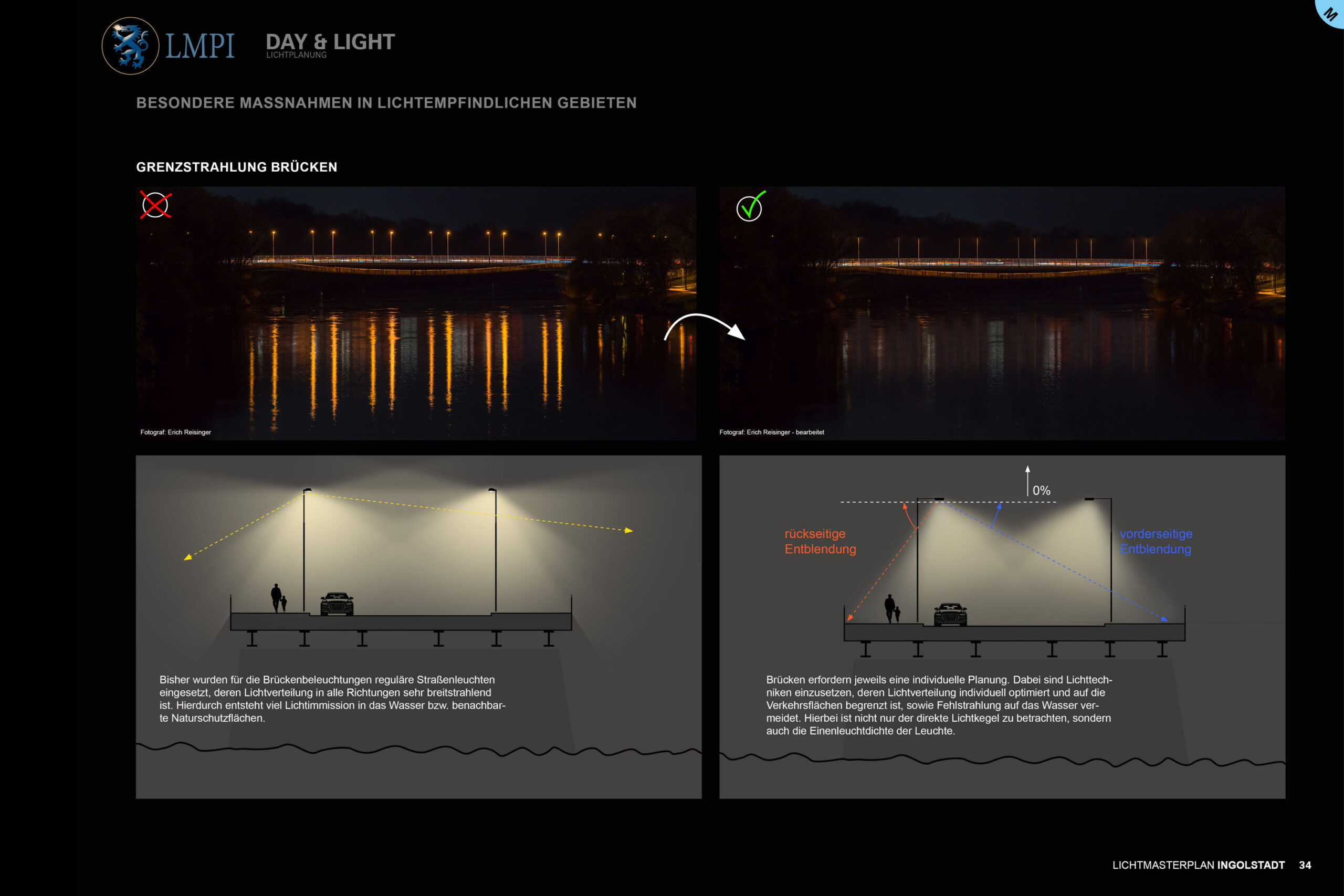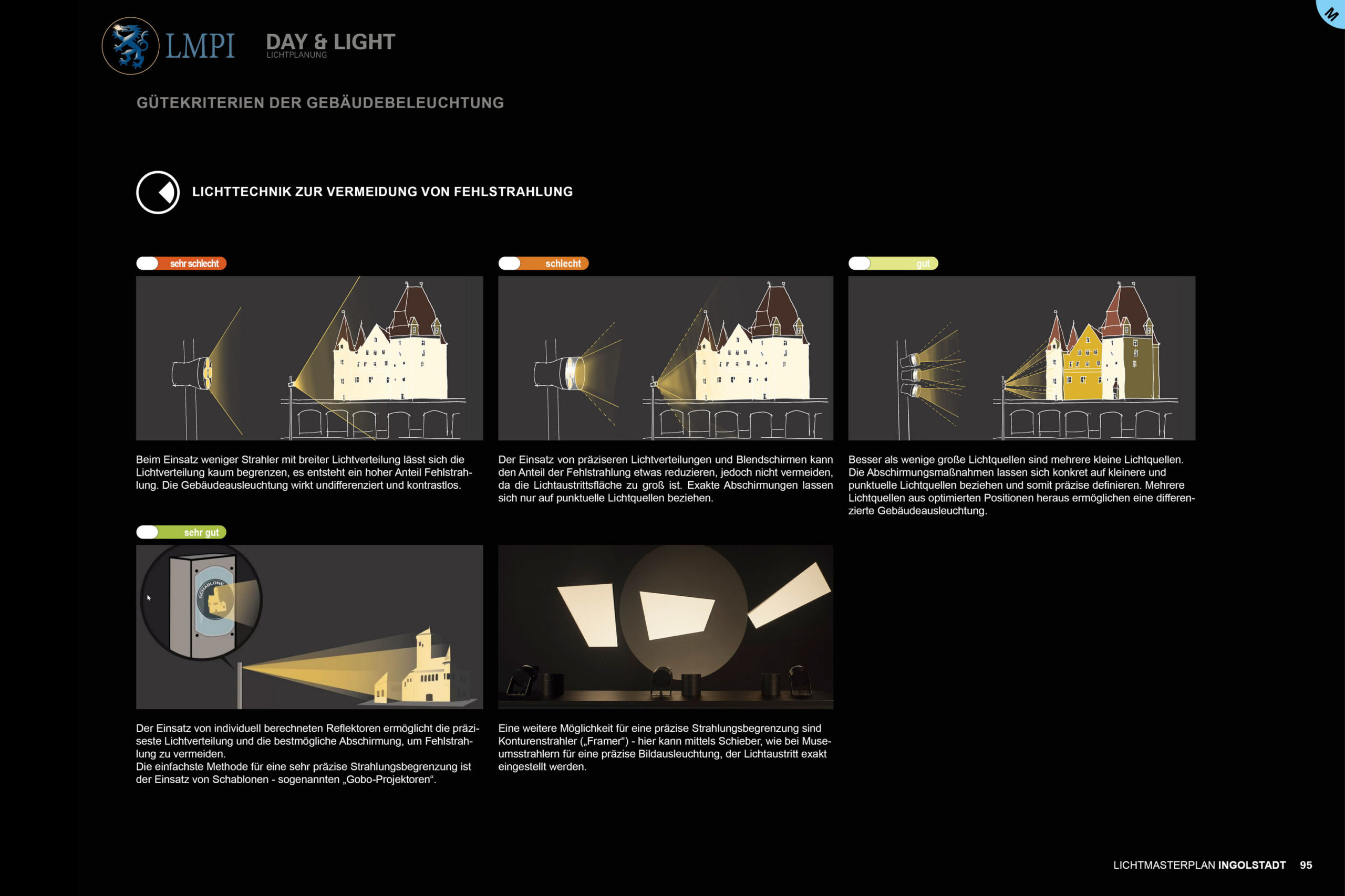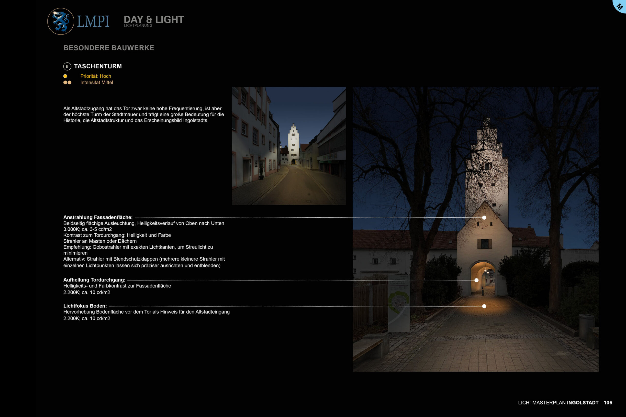 Der Lichtmasterplan Ingolstadt (LMPI) setzt sich mit der gezielten Ordnung und Gestaltung des städtischen Lichtbildes auseinander. Er soll ein praxistaugliches Werkzeug für die Stadtplanung der kommenden Jahre sein – ganzheitlich, nachhaltig und gestalterisch fundiert. Ziel ist es, ein ausgewogenes, charakterstarkes und umweltschonendes Nachtbild zu schaffen, das sowohl die historische Altstadt als auch moderne Stadtbereiche angemessen berücksichtigt.