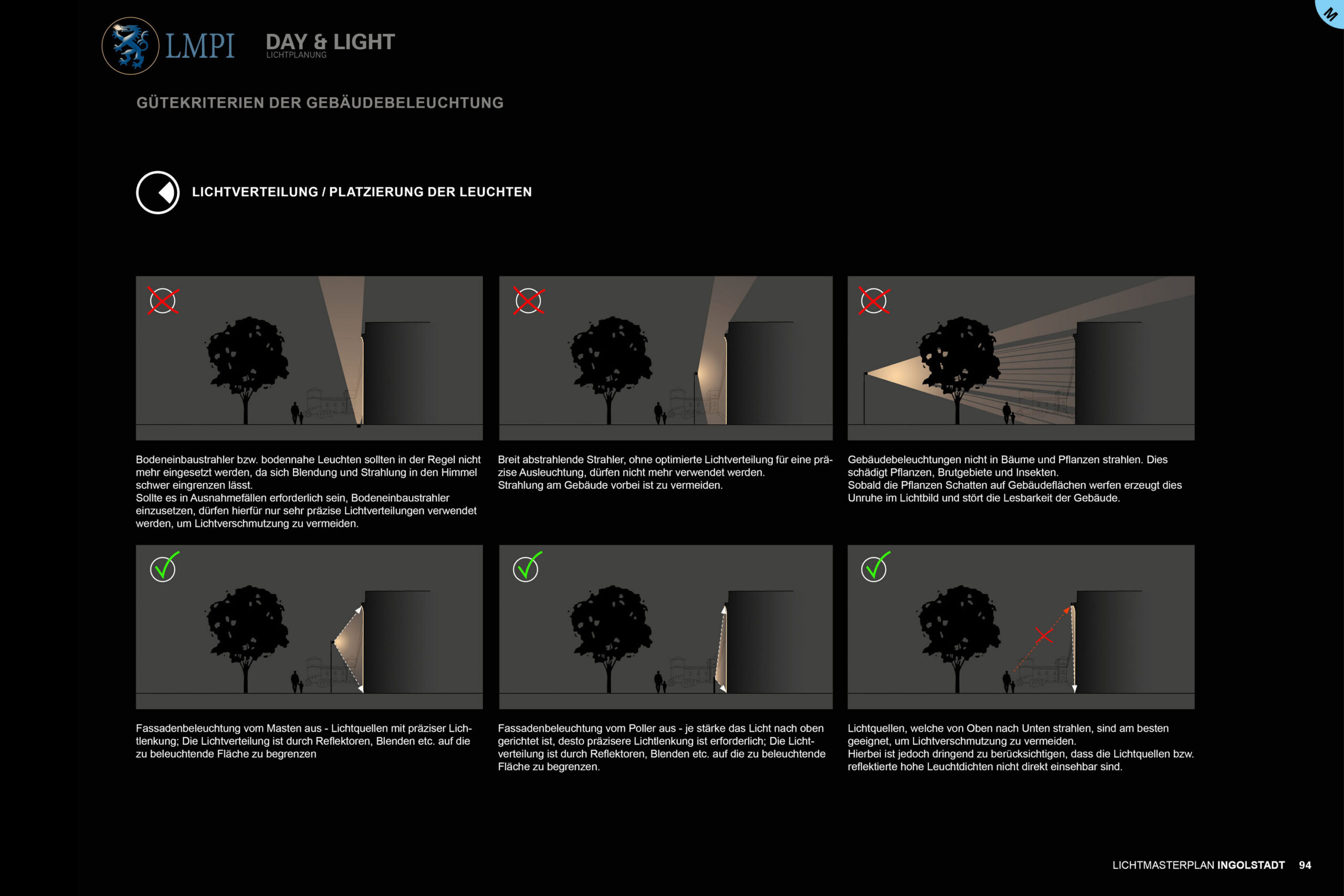Um diesem Anspruch gerecht zu werden, müssen alle Lichtquellen im Stadtraum – von der Straßenbeleuchtung über private und gastronomische Außenanlagen bis hin zu Werbe- und Fassadenbeleuchtung – unter einem gemeinsamen gestalterischen und funktionalen Rahmen betrachtet werden. Der LMPI liefert dafür die notwendige Grundlage.