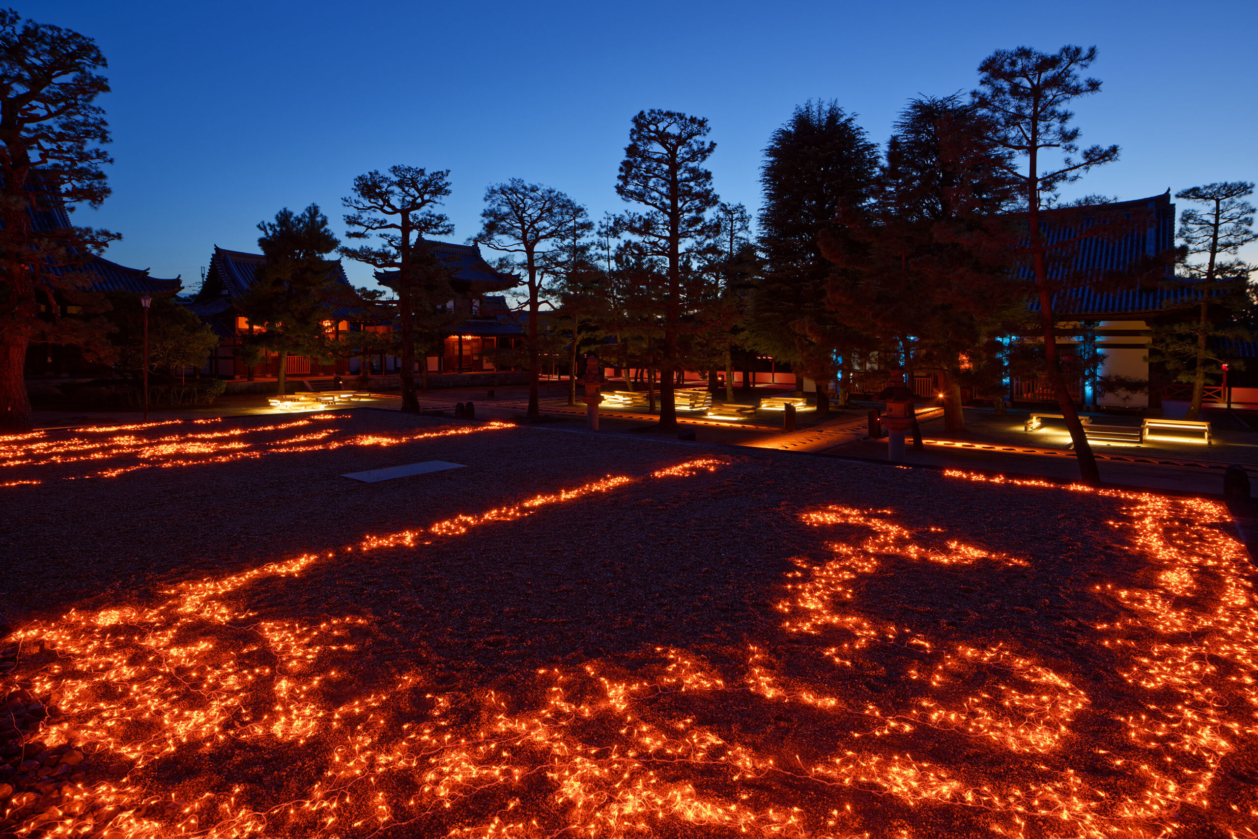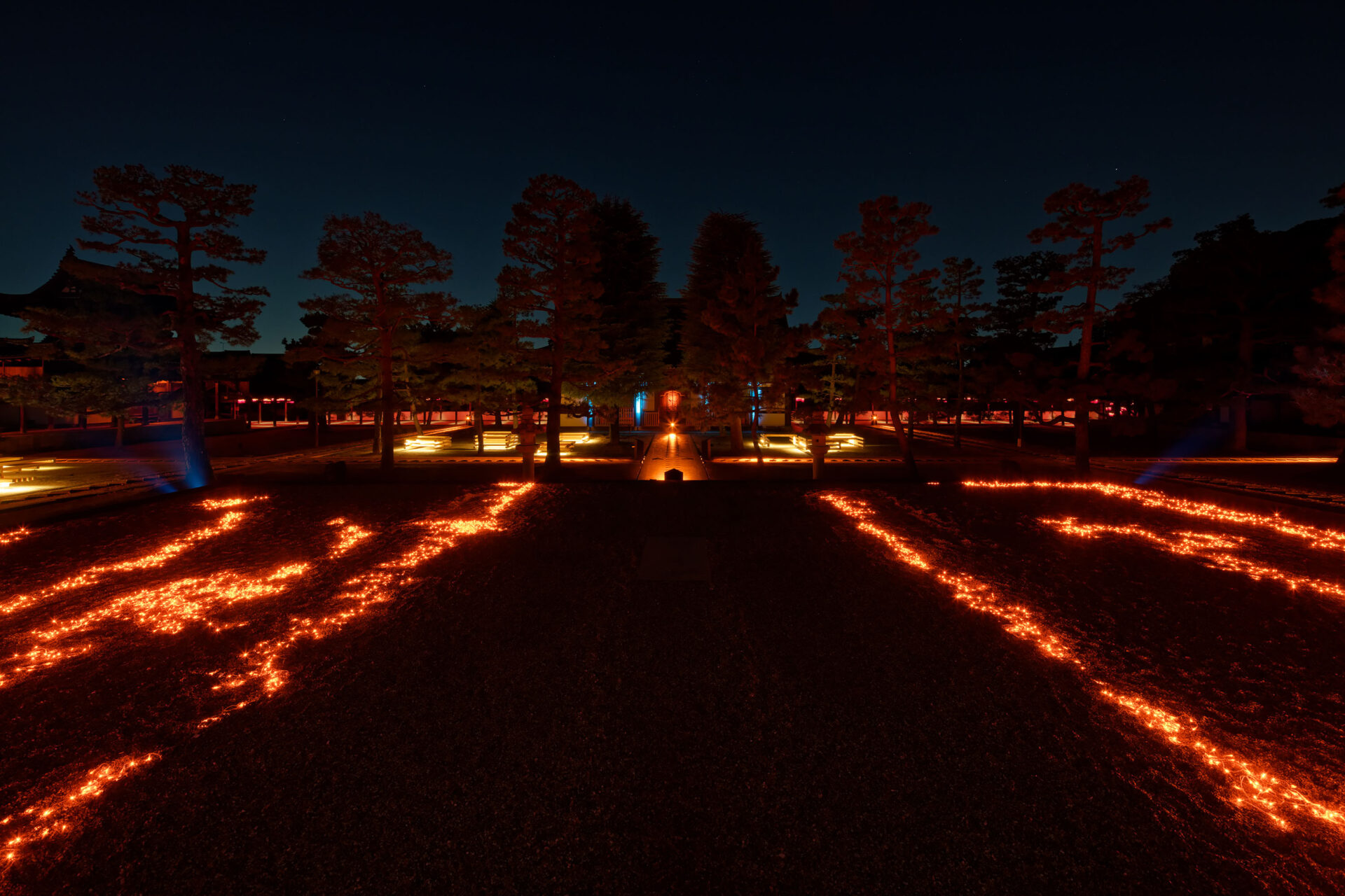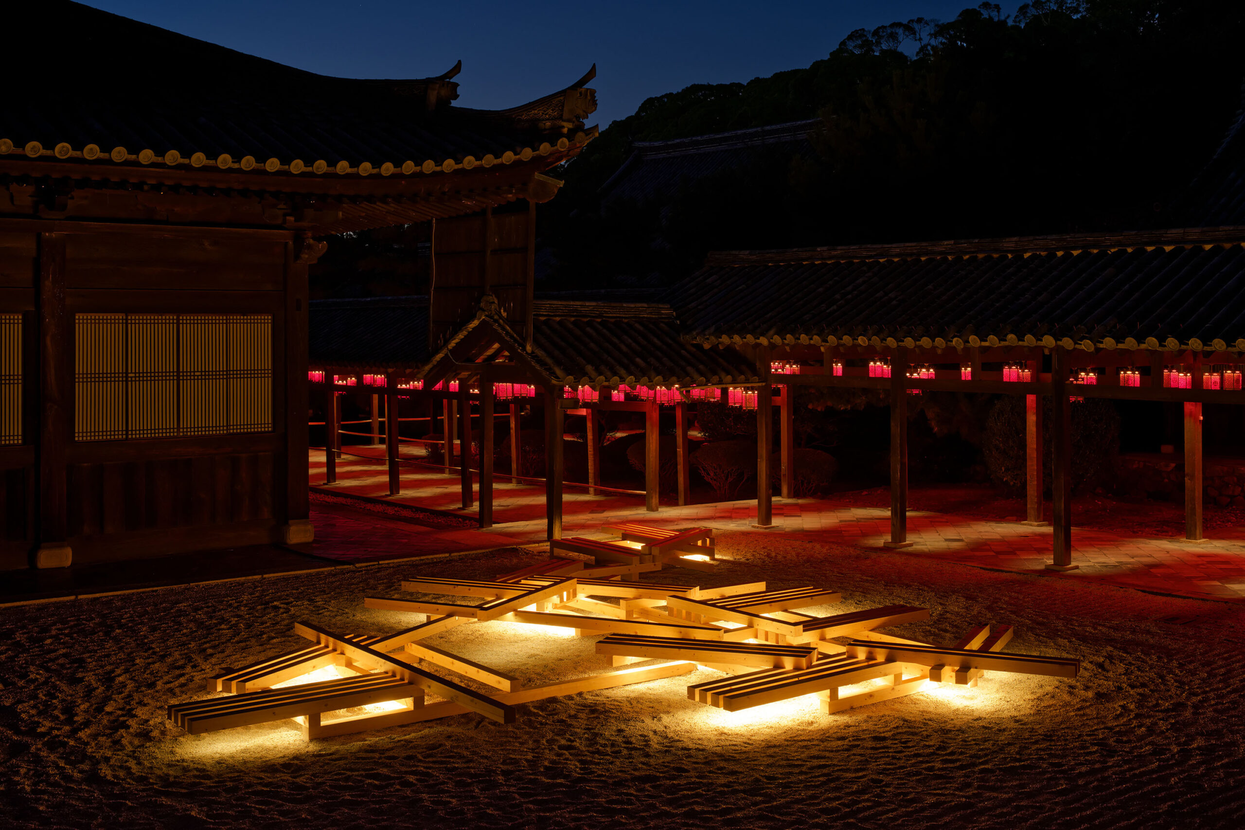 Die in Kooperation zwischen dem Architekturbüro GENETO und dem Lichtplaner Frank Vetter entwickelte Inszenierung verzichtet bewusst auf Dekoration. Allein das Licht bildet – wie eine Manga-Zeichnung oder ein Gemälde auf nachtschwarzer Leinwand – die Besonderheiten der Tempelgärten und Gebäude heraus.