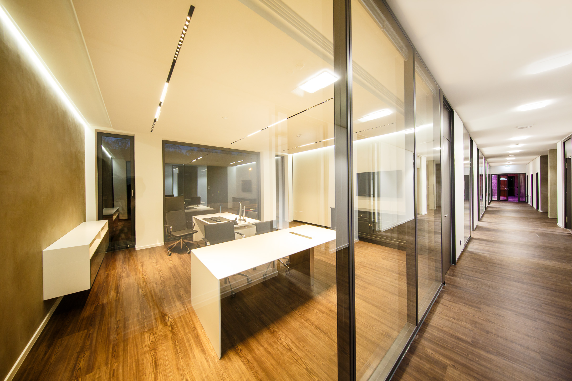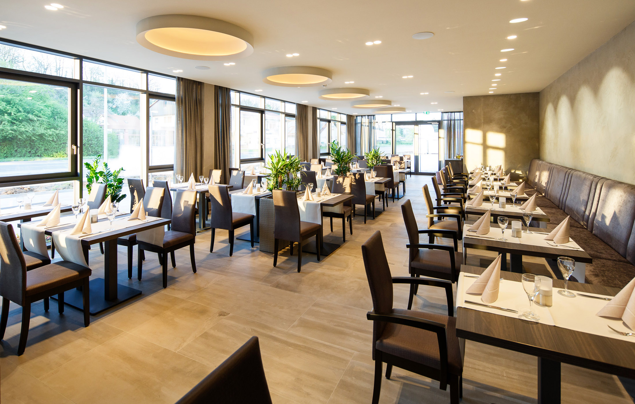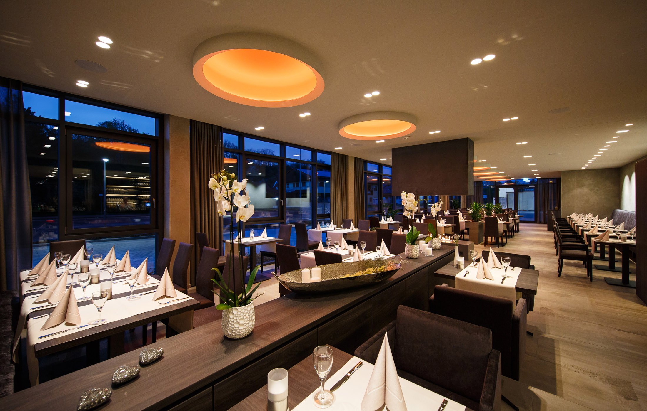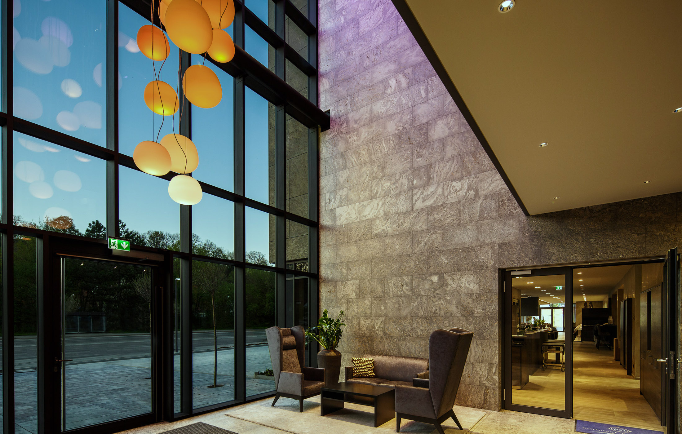 Die Büros, Schulungs- und Konferenzräume sind mit Langfeldleuchten ausgestattet und bieten einen hohen Lichtkomfort. Im Restaurant und der Lounge verändert sich das Lichtambiente über den Tag hinweg von freundlich hell bis gediegen und intim am Abend.