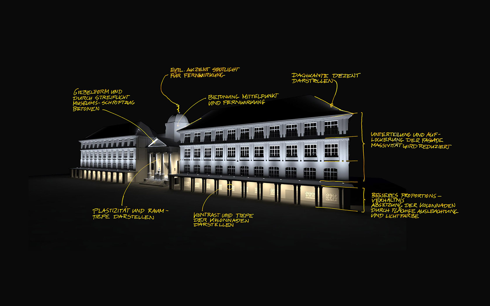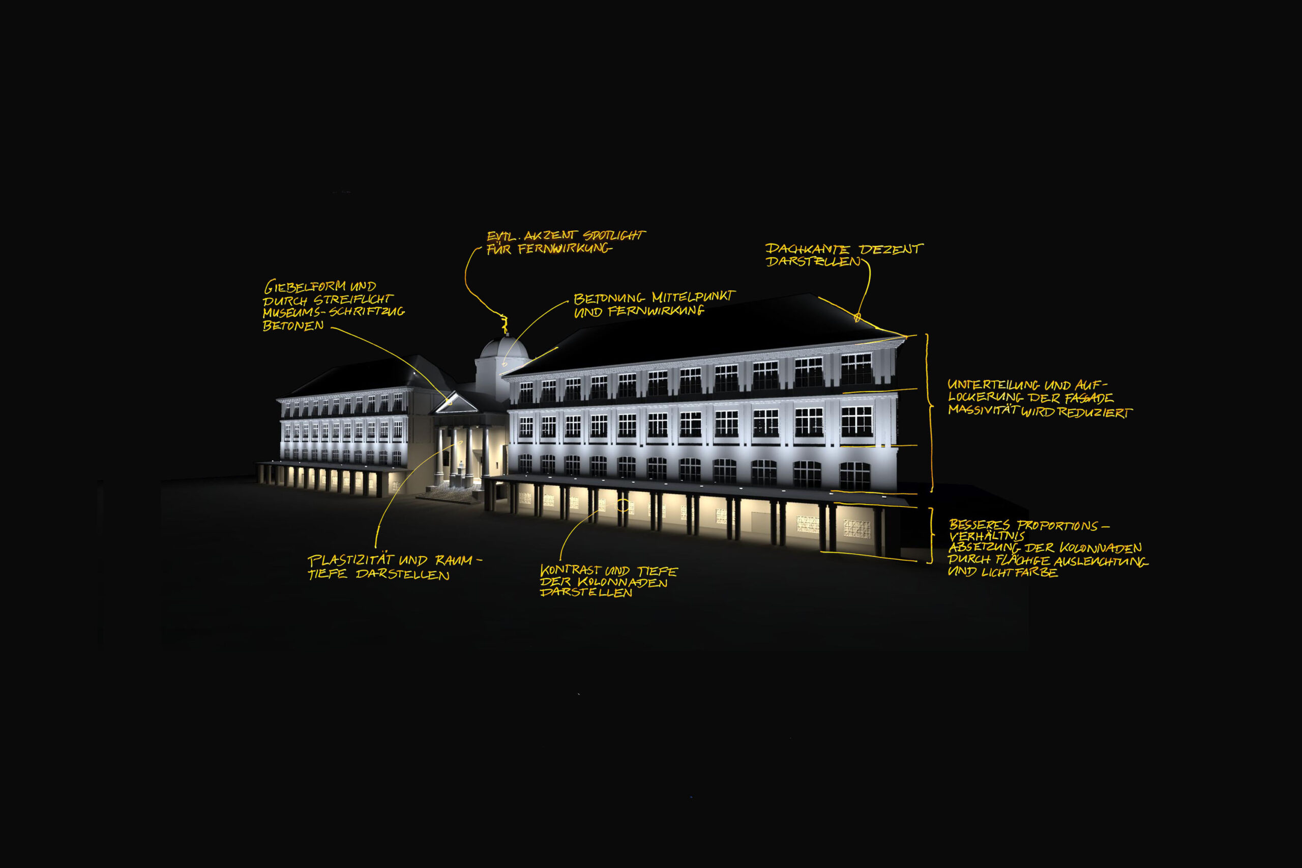 Ebenso beim Portikus heben sich die Stützen durch Streiflicht und Kontraste von der flächigen Ausleuchtung der Fassadenfläche ab. Zusammen mit gezielten Akzentuierungen erfolgt ein klares und plastisches Bild der Inszenierung.