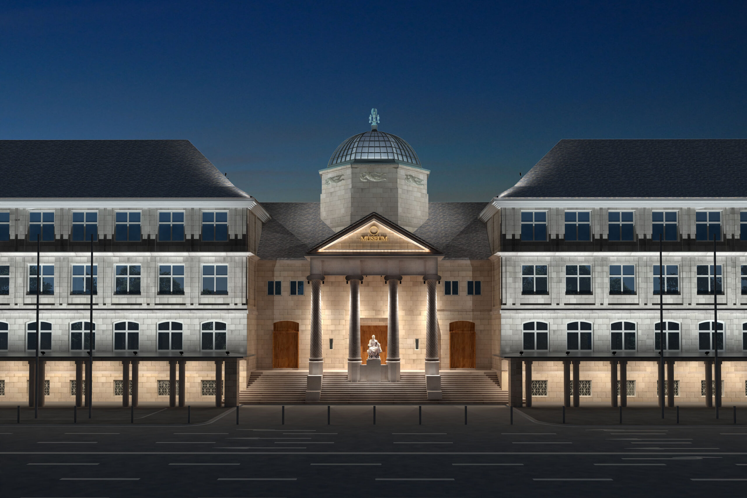 Durch den gezielten Einsatz der Lichtverteilungen und Schattenwurf des oberen Gesims ließ sich die gedrungene Proportion der neoklassizistischen Museumsfassade elegant auflockern, um ein ausgewogeneres Verhältnis zu der niedrigen Kolonnadenreihe zu erzeugen. Durch die Flächenstrahler in neutralweiß entsteht ein Kontrast in Lichtfarbe und Raumtiefe zu der Flächenausleuchtung innerhalb der Kolonnaden in warmweiß.