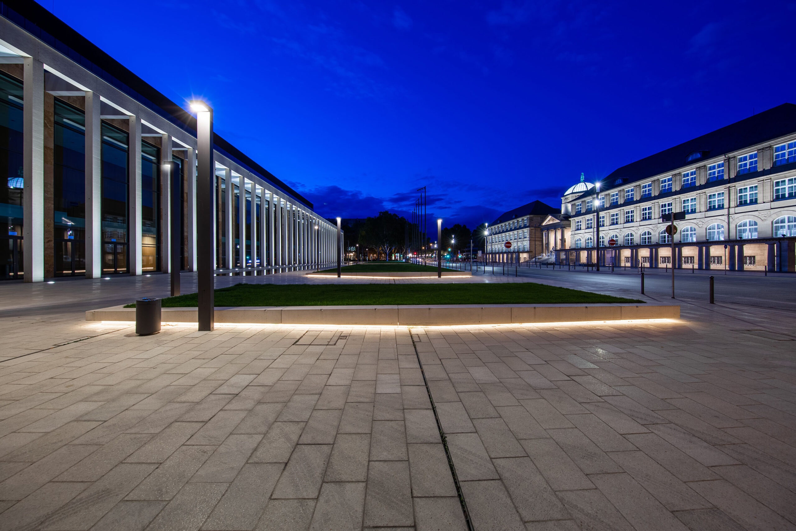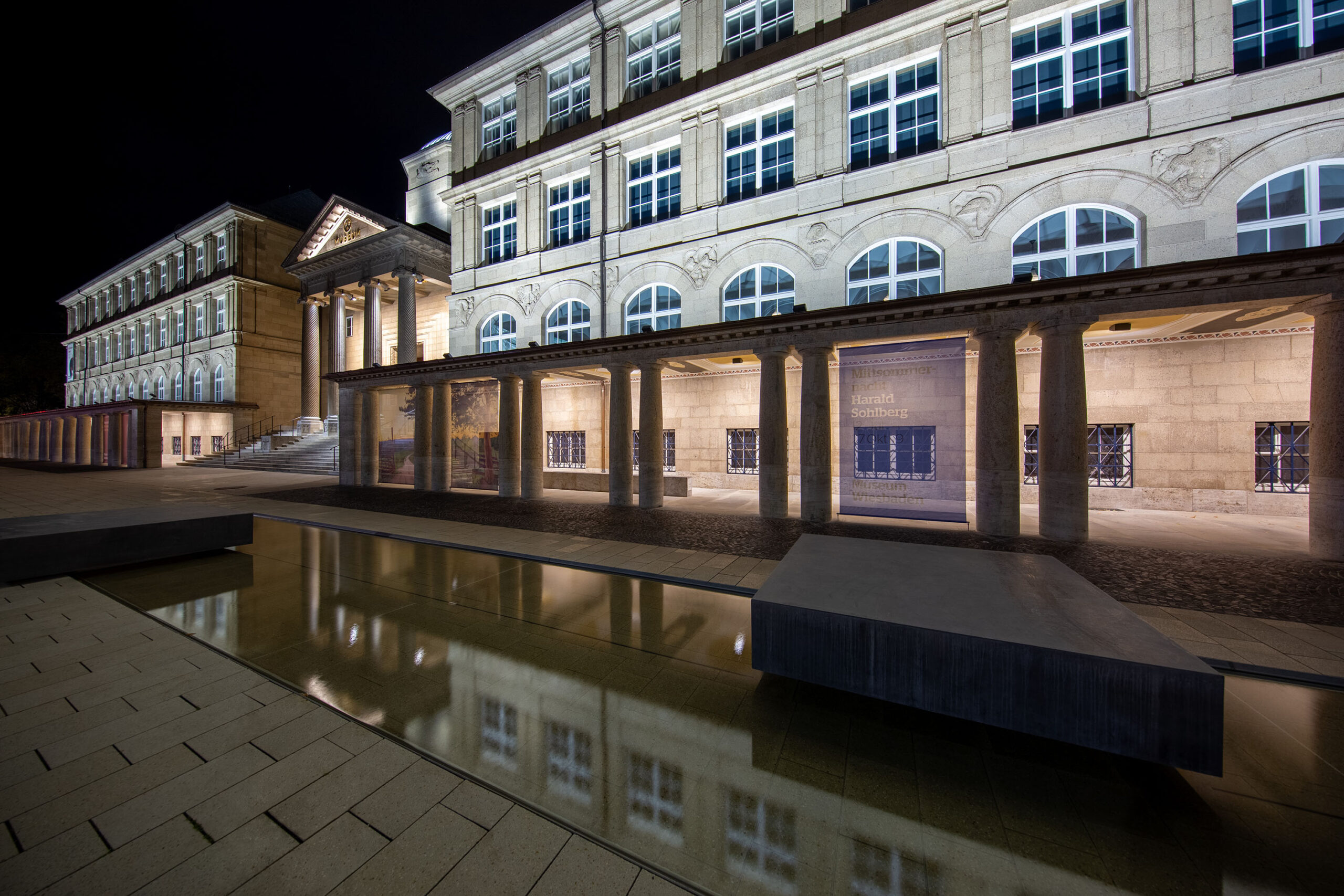 Parallel zum Neubau des Rhein-Main-Congress-Center (RMCC) wurden die zentrale Treppe und Fassade des Landesmuseums in Wiesbaden umgebaut und restauriert. Durch die Synergien beider prominenter Häuser entsteht ein moderner und hochwertiger urbaner Platz als Stadtteileingang. Eine übergreifende Planung schuf sowohl für das RMCC als auch für Platz und Landesmuseum ein ganzheitliches aufeinander abgestimmtes Beleuchtungskonzept.