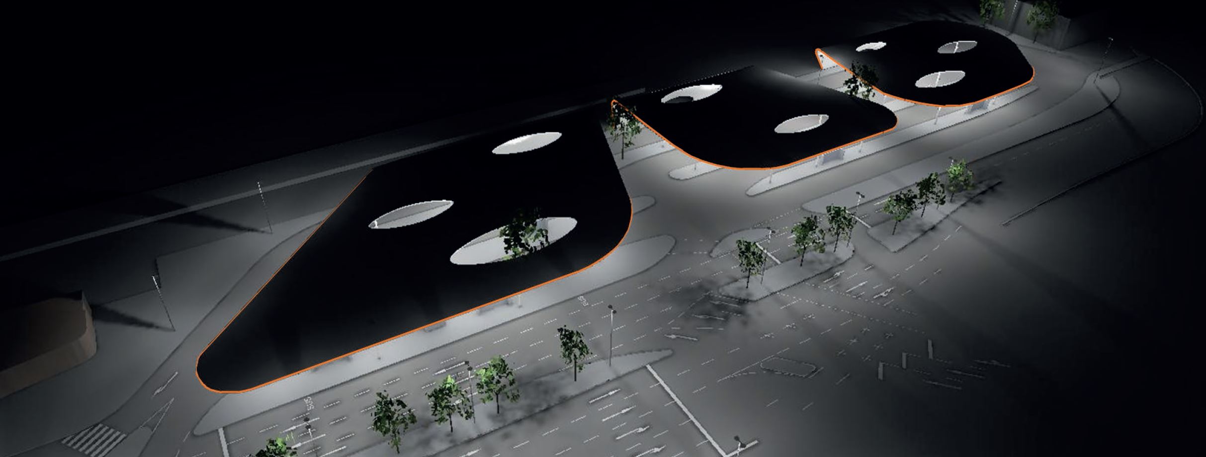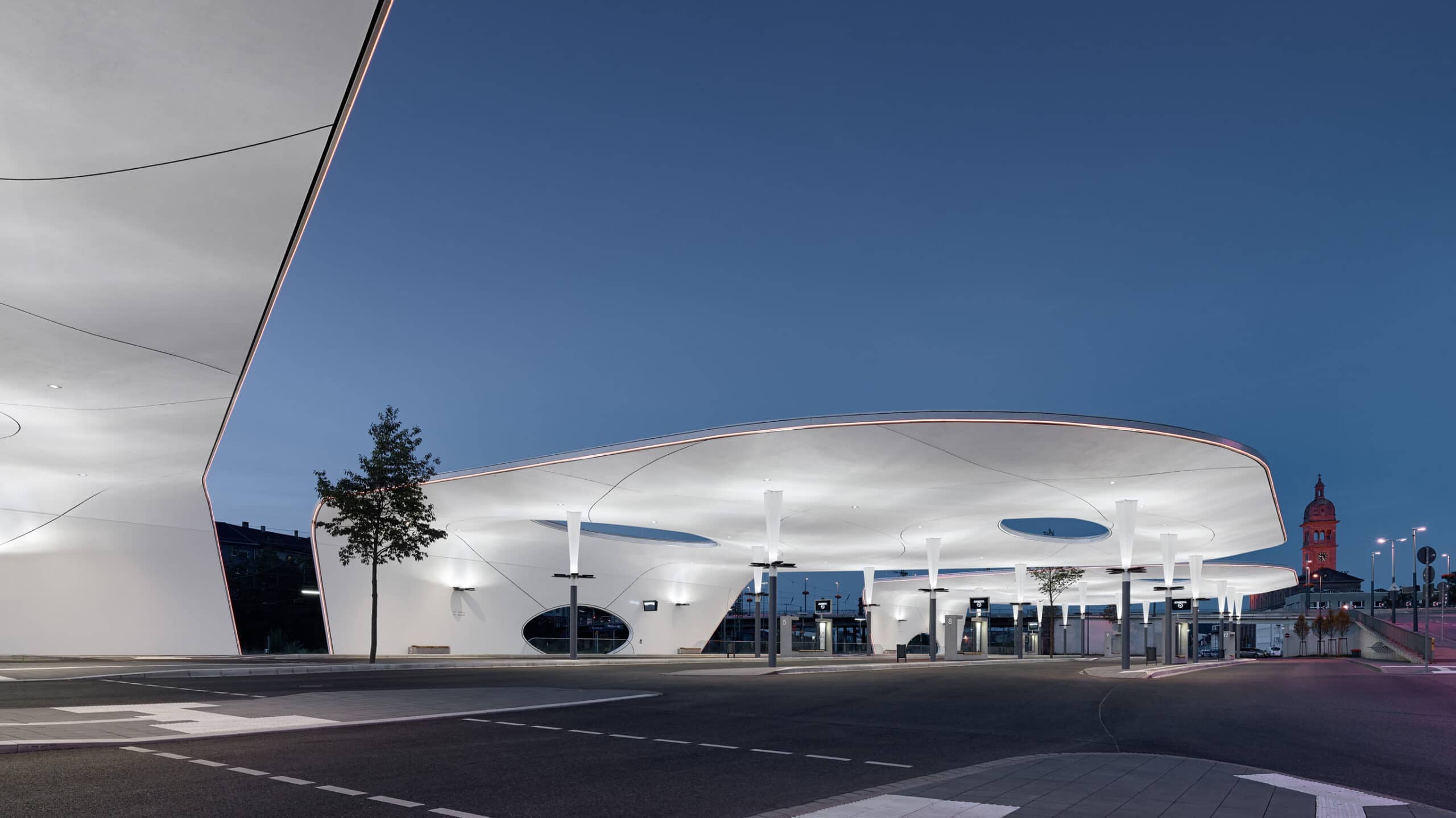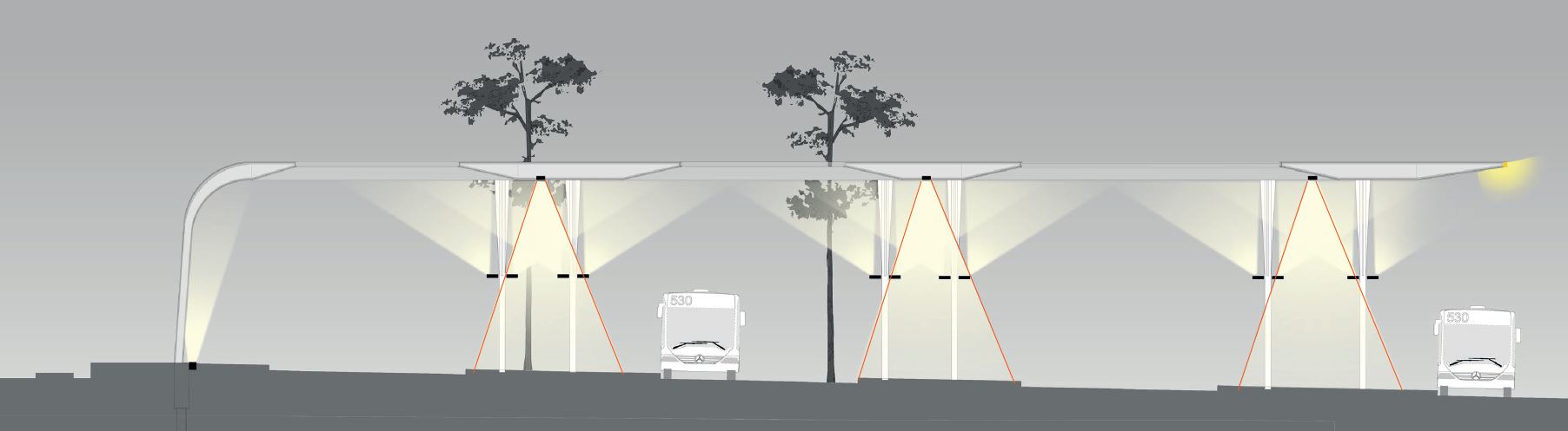 Die Beleuchtung unterstützt den Busbahnhof in seiner städtebaulichen Bedeutung und Symbolik und schafft zugleich eine für den Nutzer sichere und angenehme Umgebung. Hierbei betrachteten wir das Bauwerk nicht als Solitär, sondern als Bestandteil des Verkehrsknotenpunktes.