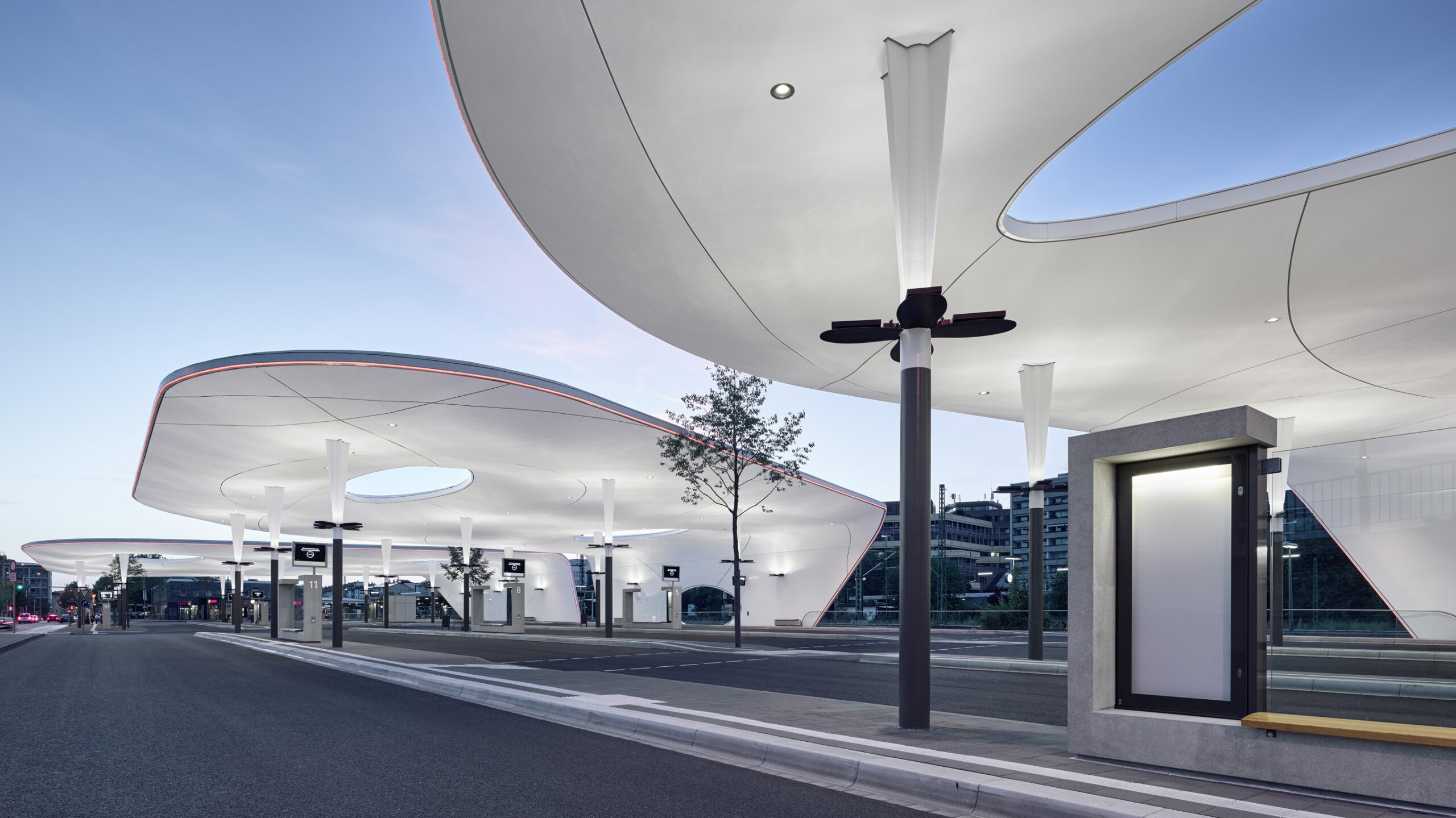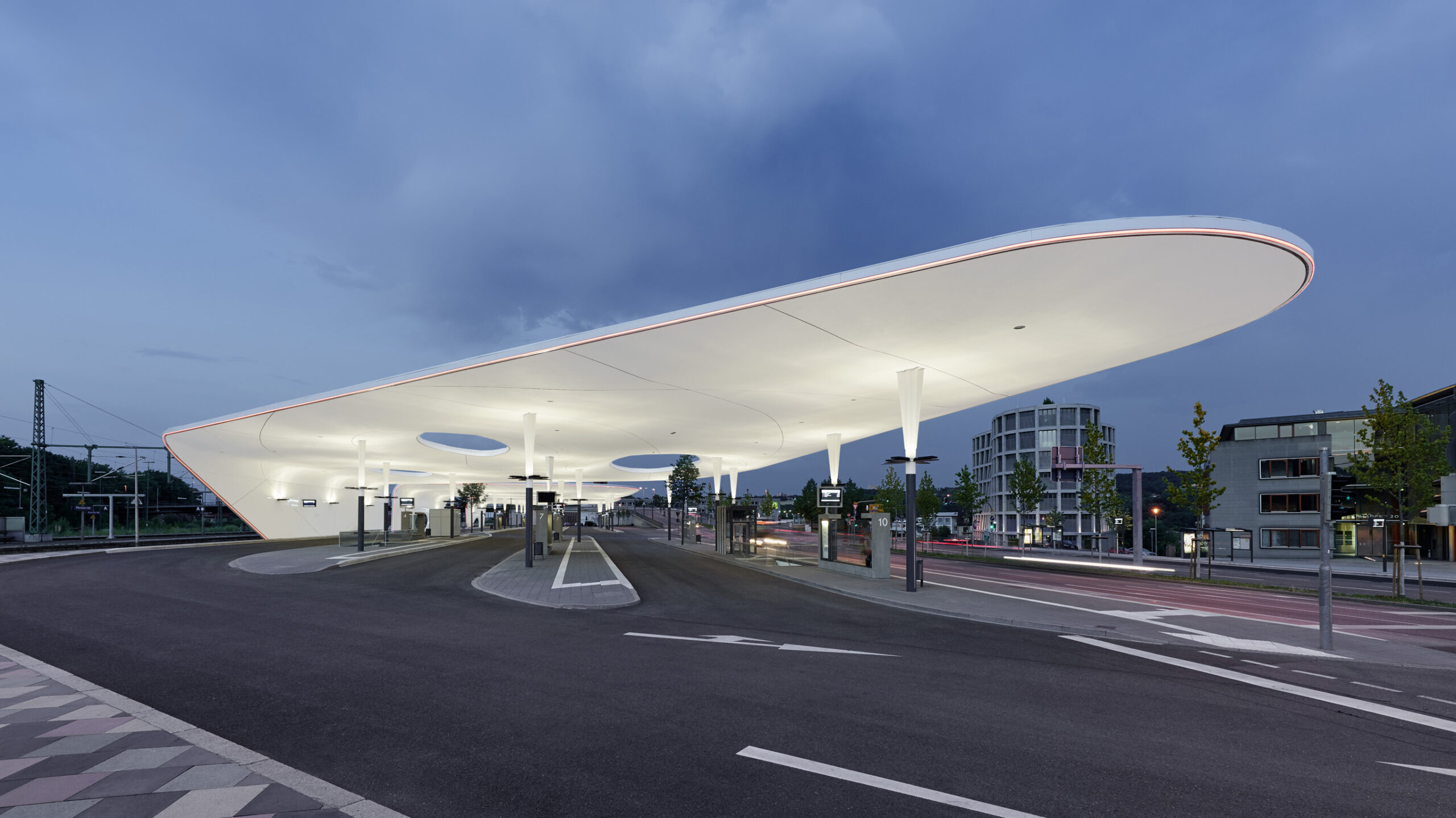 In angemessenem Abstand zum Hauptbahnhof gelegen, zeigt sich der neue ZOB als Ergänzung des historischen Gebäudes. Er setzt einen prägnanten städtebaulichen Akzent und verleiht dem bisher eher unwirtlichen Raum östlich des Bahnhofgebäudes Charakter und Aufenthaltsqualität. Anstatt einer monotonen Anordnung von Bussteigen ist ein überdachter Stadtraum mit hohem Wiederkennungswert entstanden. Die Unterteilung der Dachfläche in drei Segmente ordnet den ZOB dem Maßstab des Hauptbahnhofs unter, erhält dessen optische Dominanz und Stellenwert im Stadtgefüge und lässt gleichzeitig spannende Durchblicke und Bezüge zu den Stadtteilen nördlich der Bahnlinie zu.