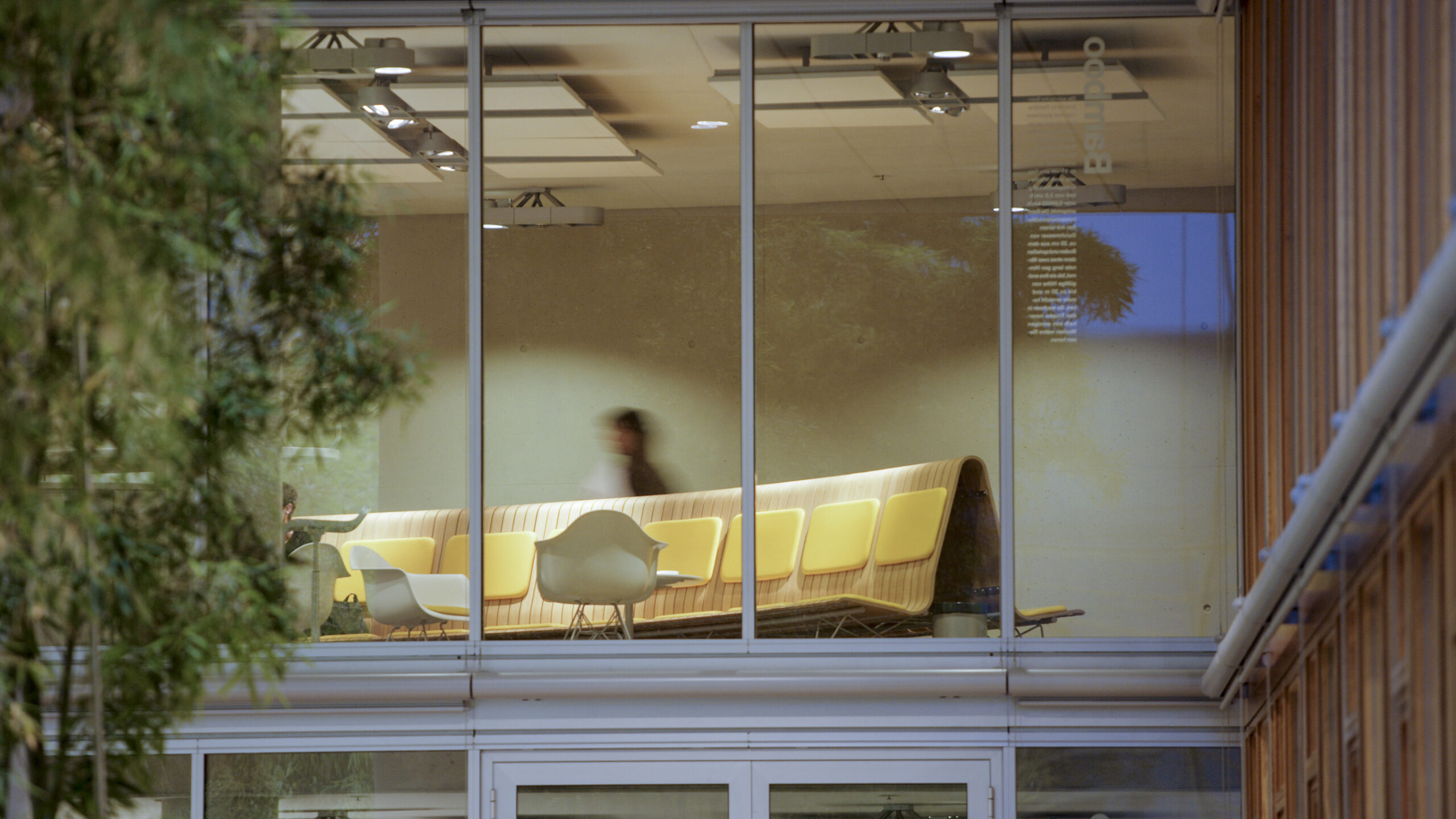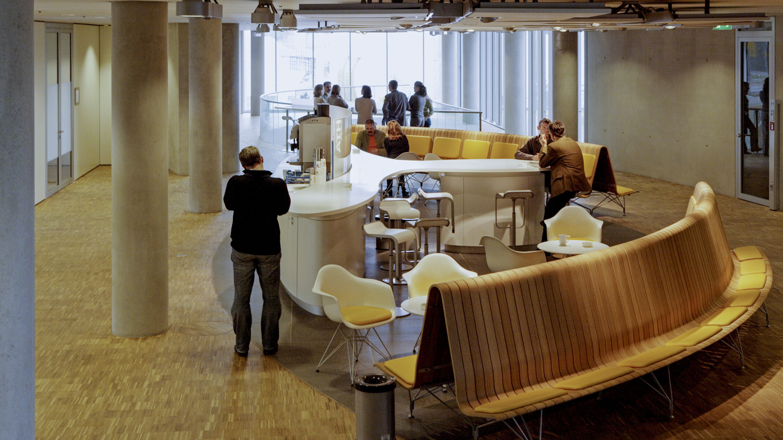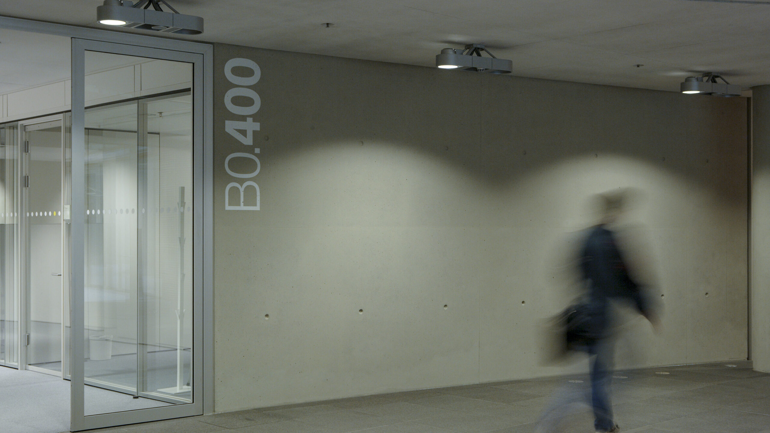 Im Sinne eines klaren und einfachem Gestaltungskonzeptes der Innenräume wurde für die offenen Betondecken ein einzigartiges Technik-System entwickelt, welches Beleuchtung, Akustik und Haustechnik vereint.
