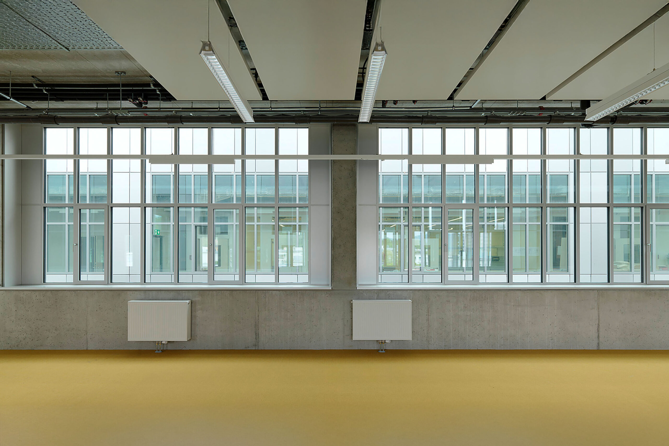 Die schmalen, längsgerichteten Baukörper wurden in ihrer Tiefe und Orientierung konsequent auf optimale Tageslichtversorgung und natürliche Belüftung hin untersucht. Die vertikale Staffelung – mit zweigeschossigen Hörsälen und Aula sowie der darüberliegenden Campusebene als Verteilerebene – ermöglichte klar zonierte Tageslichtkonzepte für öffentliche, halböffentliche und forschungsbezogene Bereiche.