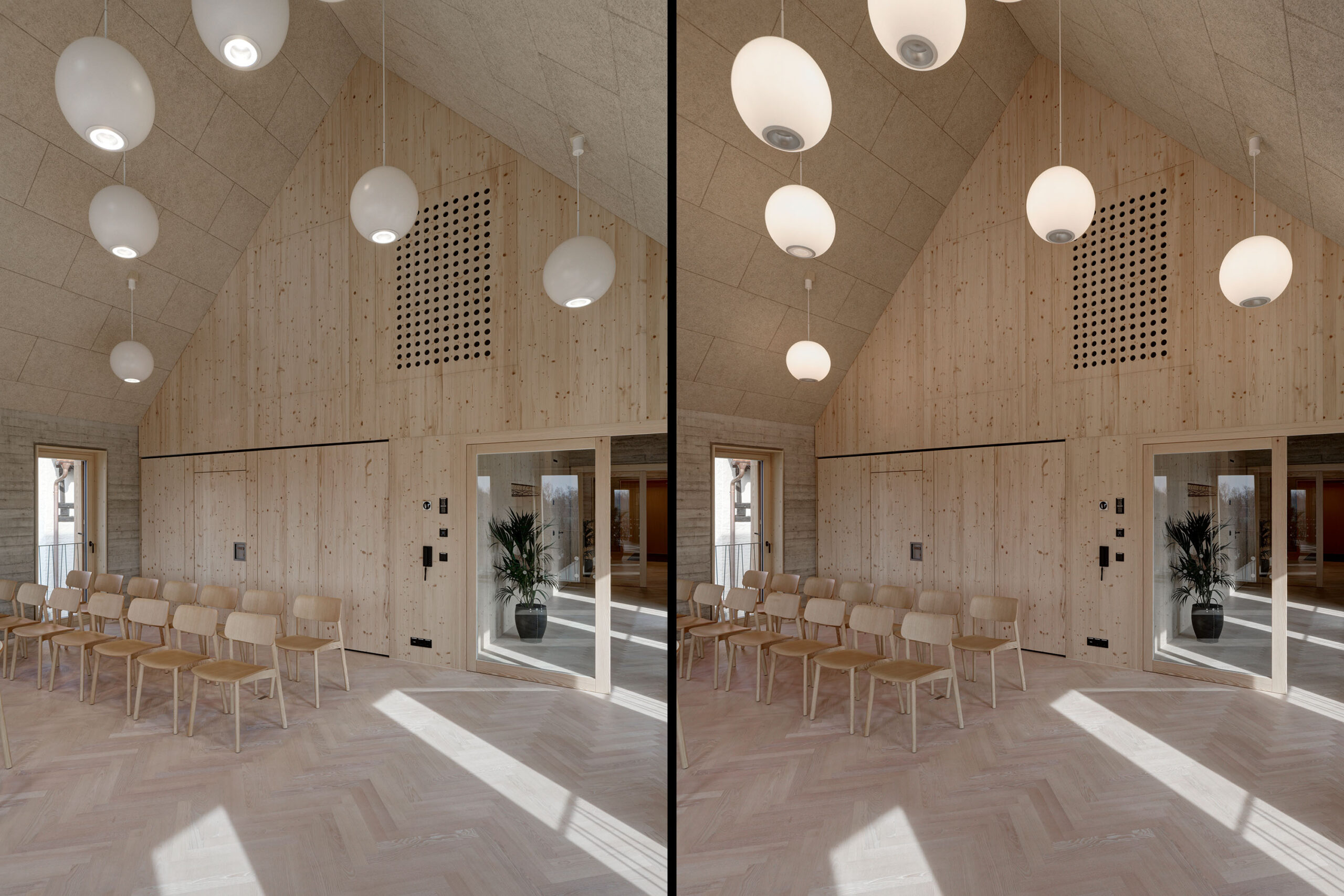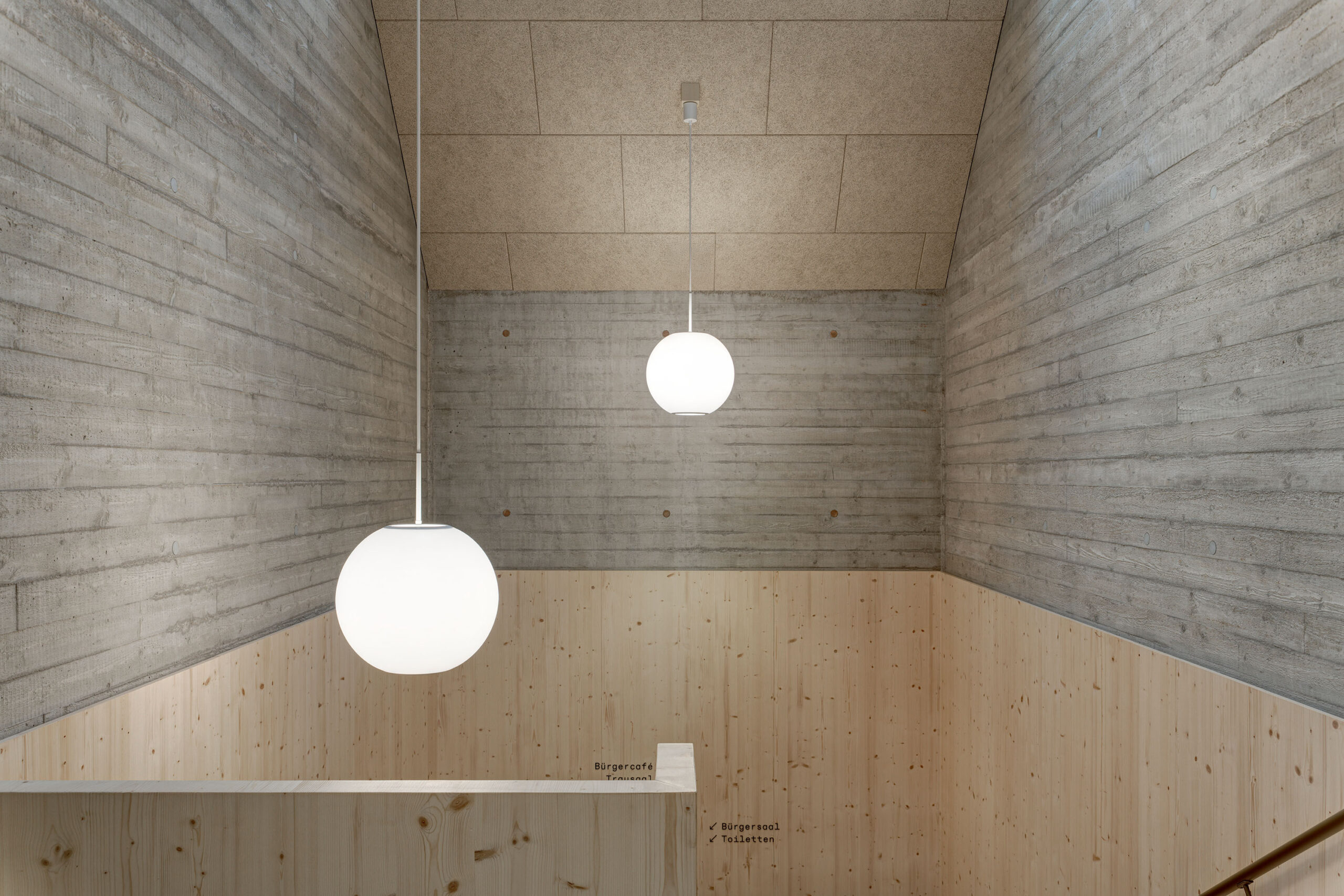 Im Inneren folgt die Beleuchtung derselben Haltung: zurückhaltend in der Form, vielseitig in der Funktion. Im Bürgersaal ermöglicht ein flexibles Schienensystem sowohl flächige Grundbeleuchtung als auch punktuelle Akzentuierungen – ideal für Konzerte, Vorträge oder Feiern. Das Foyer profitiert von der gleichen Flexibilität, während die Räume im Obergeschoss durch zweistufig schaltbare Lichtkugeln sowohl sanftes Flächenlicht als auch fokussierte Downlights bieten.