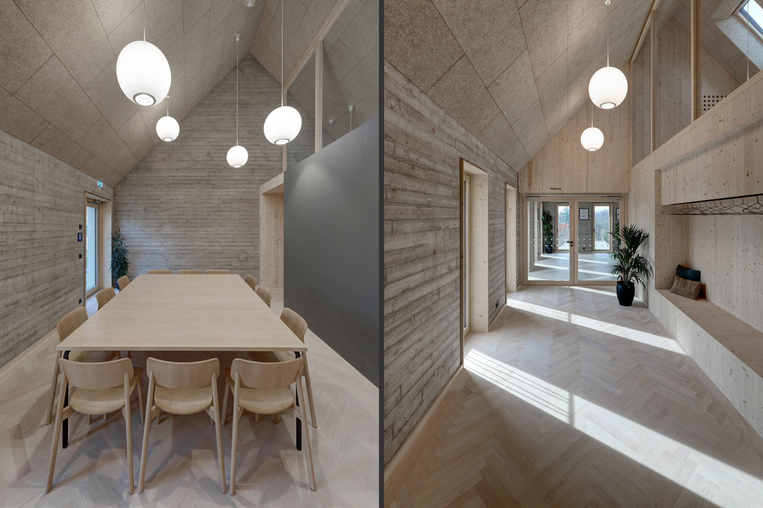 Ein besonderer Akzent liegt im Café: Hier tauchen gläserne Kugelleuchten den Raum in ein warmes, beinahe poetisches Licht. Ihre seifenblasenartige Anmutung erzeugt Leichtigkeit und zugleich eine feine Plastizität, die die Holzarchitektur unterstützt und eine einladende Café-Atmosphäre schafft.