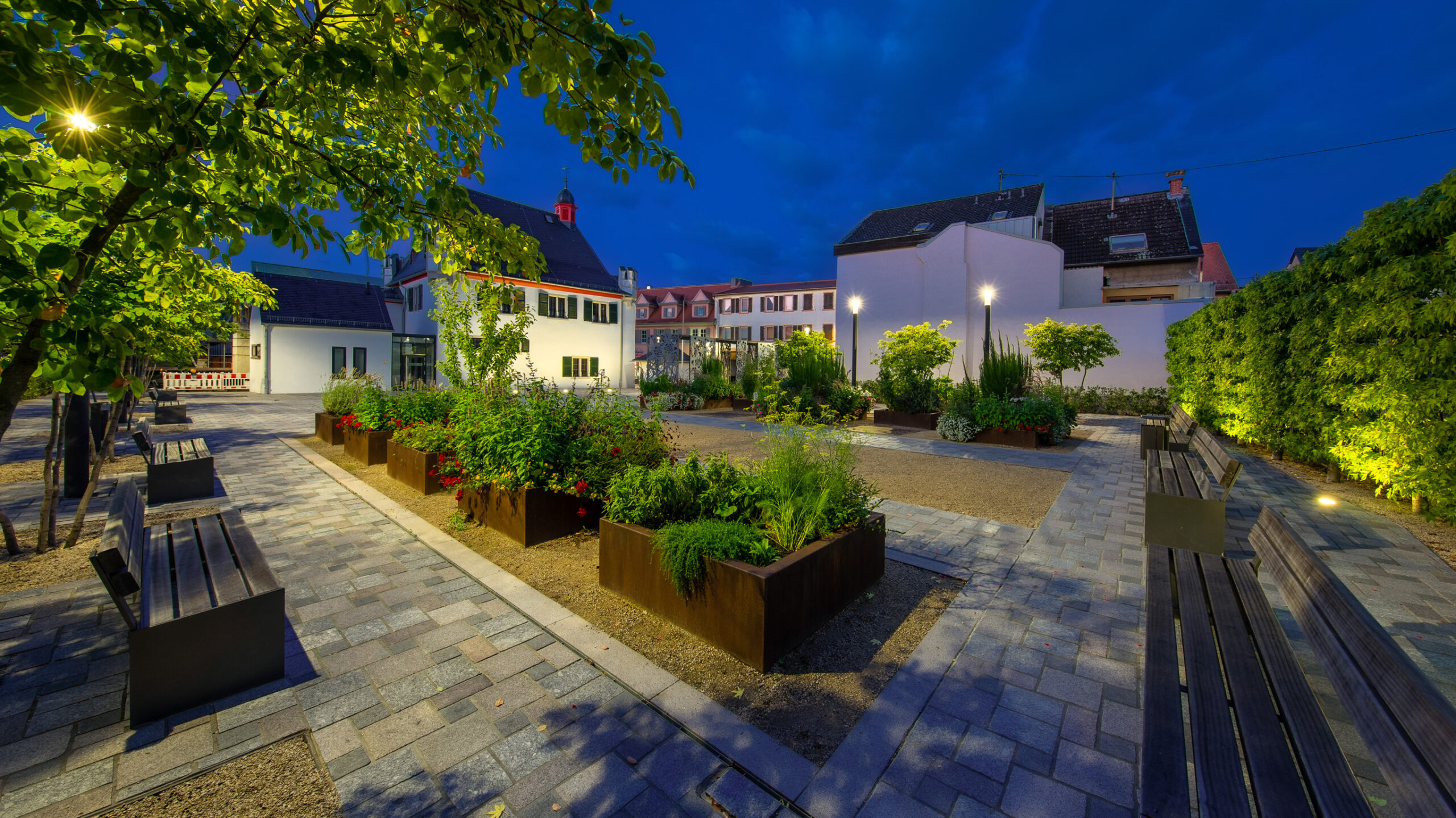 Diese besondere Qualität setzt sich in den Abendstunden fort – subtil und doch spürbar. Der Grund erschließt sich erst dem aufmerksamen Beobachter: Es gibt keine blendenden Lichtquellen. Stattdessen entsteht ein atmosphärisch angenehmer Raum, gegliedert durch Zonierungen, Akzente und Kontraste, die einerseits die Platzgeometrie lesbar machen und andererseits individuelle Aufenthaltsinseln schaffen.