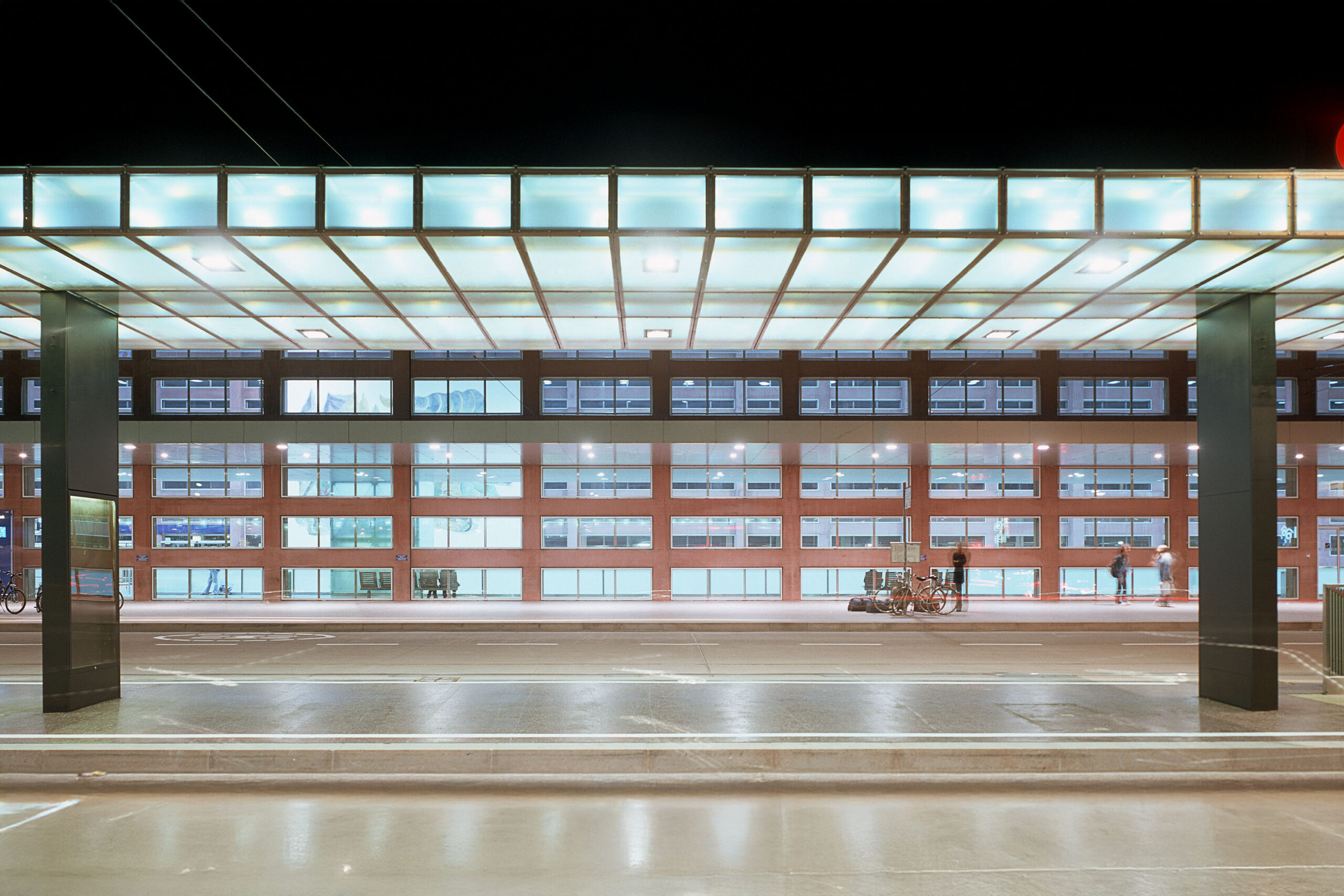Der Hauptbahnhof Innsbruck präsentiert sich als lichtgefüllter, transparenter Baukörper und bildet den Abschluss des Südtiroler Platzes. Dank seiner hellen Innenseiten und der reduzierten Leuchtdichte der Außenfassade strahlt die Halle bei Dämmerung wie ein selbstleuchtender Raum. Diese Lichtarchitektur unterstreicht die Themen Transparenz und Transluzenz, die auch im Umfeld des Bahnhofs durch die Materialwahl im Südtiroler Platz hervorgehoben werden. Besonders prägnant ist die Wartezonenüberdachung, deren teiltransparentes Material durch Hinterleuchtung optisch aufgelöst wird, was ein harmonisches und einladendes Erscheinungsbild schafft.